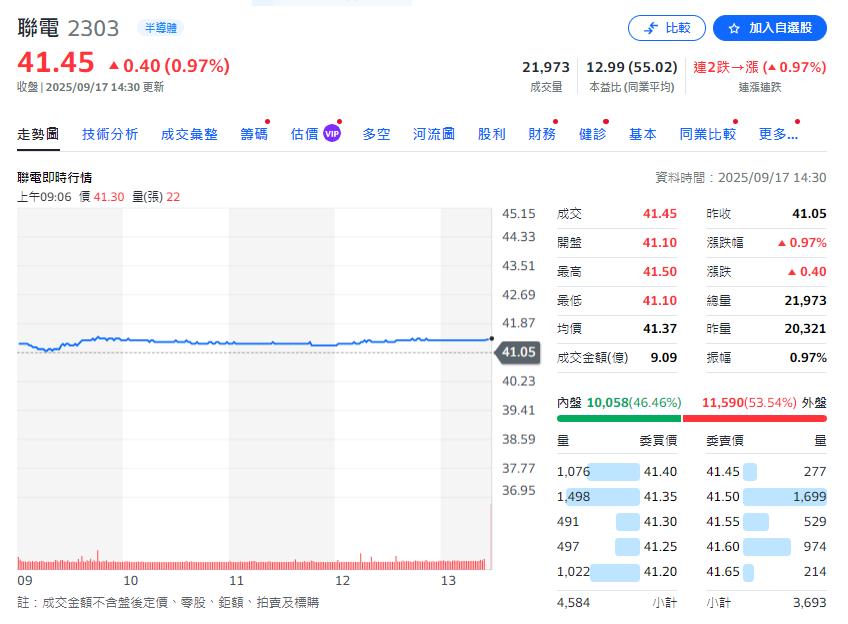 聯電受外資大買 股價開高走高(圖/奇摩股市)