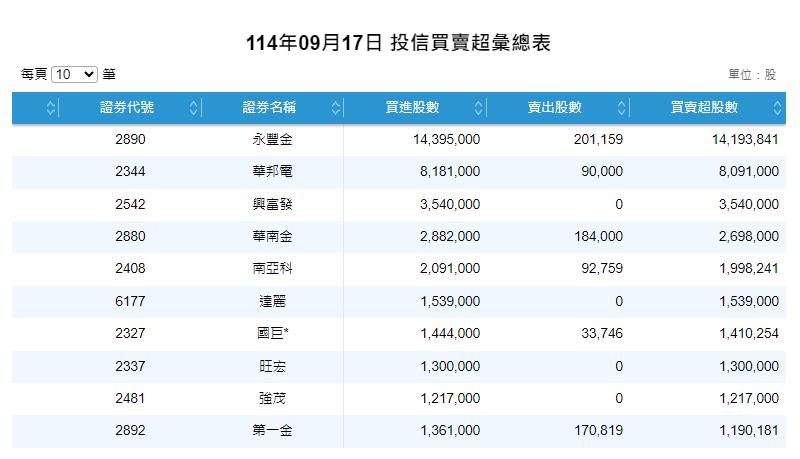 投信週三買超前5大個股,依序為永豐金(2890)1.4萬張、華邦(2344)8091張、興富發(2542)3540張、華南金(2880)2698張、南亞科(2408)1998張。