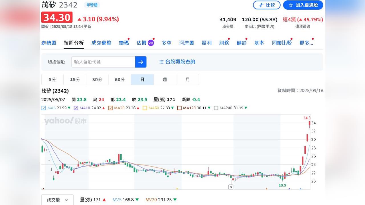 在AI運算能力不斷提升下,散熱效果成為瓶頸,近期傳出輝達有意將矽中介層材料升級成碳化矽,讓資金看好相關族群表現。也因此功率半導體晶圓代工廠茂矽(2342)近日股價狂飆,昨(18)日再度攻上漲停價34.3元,這已經是連拉第5根漲停,創去年12月中以來9個月高價。