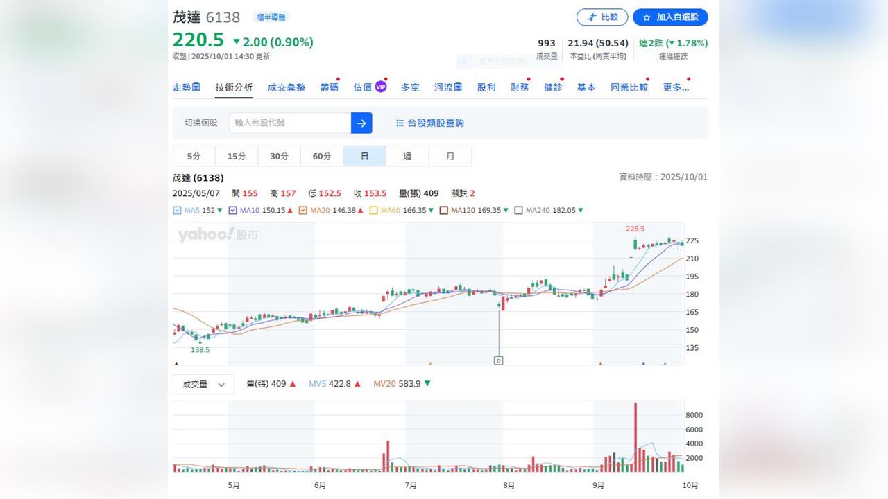 茂達昨天下跌2元 收在220.5元(圖/奇摩股市)