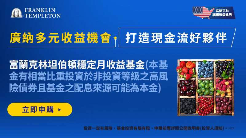 <本文提及之經濟走勢預測不必然代表本基金之績效><本頁不代表對任一個股的買賣建議><投資人申購本基金係持有基金受益憑證,而非本文提及之投資資產或標的><投資人因不同時間進場,將有不同之投資績效,且過去績效不代表未來績效之保證。>。【富蘭克林證券投顧獨立經營管理】非投資等級債券基金警語:本基金經金融監督管理委員會核准,惟不表示絕無風險。由於非投資等級債券之信用評等未達投資等級或未經信用評等,且對利率變動的敏感度甚高,故本基金可能會因利率上升、市場流動性下降,或債券發行機構違約不支付本金、利息或破產而蒙受虧損。新興市場基金警語:本基金之主要投資風險除包含一般股票型基金之投資組合跌價與匯率風險外,與成熟市場相比須承受較高之政治與金融管理風險,而因市值及制度性因素,流動性風險也相對較高,新興市場投資組合波動性普遍高於成熟市場。本境外基金經金融監督管理委員會核准或申報生效在國內募集及銷售,惟不表示絕無風險。基金經理公司以往之經理績效不保證基金之最低投資收益;基金經理公司除盡善良管理人之注意義務外,不負責本基金之盈虧,亦不保證最低之收益,投資人申購前應詳閱基金公開說明書。本公司所提供之資訊,僅供接收人之參考用途。本公司當盡力提供正確之資訊,所載資料均來自或本諸我們相信可靠之來源,但對其完整性、即時性和正確性不做任何擔保,如有錯漏或疏忽,本公司關係企業與其任何董事或受僱人,並不負任何法律責任。任何人因信賴此等資料而做出或改變投資決策,須自行承擔結果。Ⓞ投資基金所應承擔之相關風險及應負擔之費用(含分銷費用)已揭露於基金公開說明書及投資人須知中,投資人可至境外基金資訊觀測站(http://www.fundclear.com.tw)下載,或逕向本公司網站( http://www.Franklin.com.tw )查閱。富蘭克林證券投資顧問股份有限公司|114年金管投顧新字第018號|台北市忠孝東路四段87號8樓|0800-885-888|www.Franklin.com.tw
