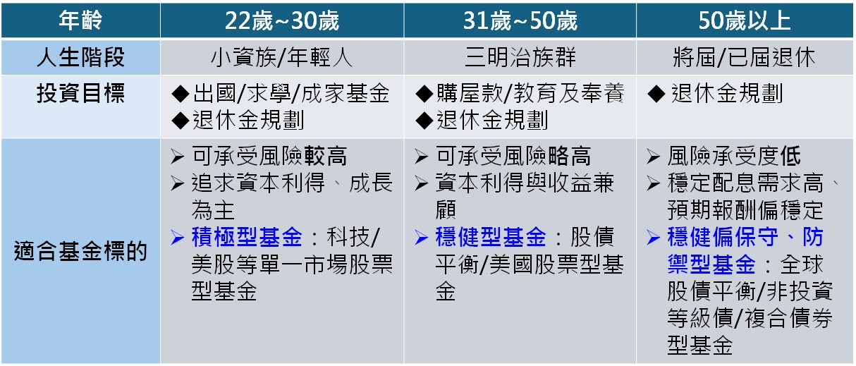 三、中長期投資規劃,例如退休金,需提早且動態調整。在有薪水等固定收入時,側重穩健不失積極的策略,無固定收入時,方調整為保守型的投資組合。