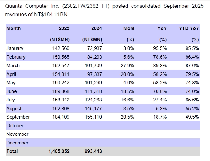 廣達(2382)8日公布9月營收1,841.09億元,創史上第三高,受惠AI伺服器需求暢旺,並月增20.48%,年增18.7%,今年前九個月營收為1.485兆元,年增49.49%。