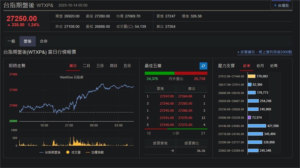 台指期盤後上漲335點、漲幅1.24%,收27250點。