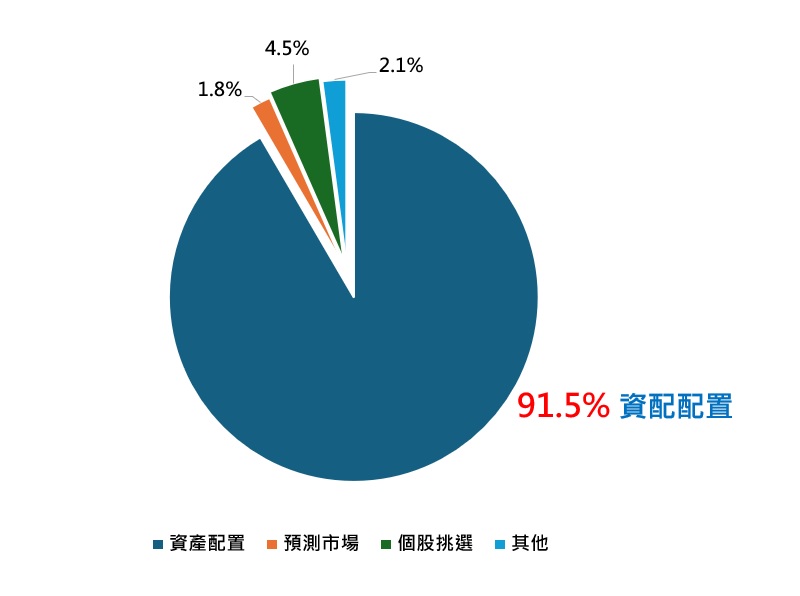 資料來源:Financial Analysts Journal,根據美國主要退休基金所作的十年期長期績效的實證調查,實證結果證明影響投資報酬率主要是來自於完善的資產配置,而非預測市場或者是個股挑選買明牌等原因。