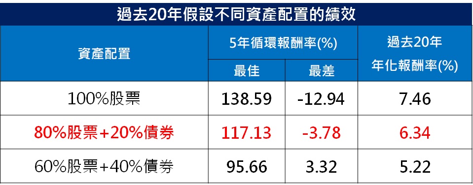 資料來源:理柏資訊,美元計價,資料時間:2004/12/31~2024/12/31。股票部份以MSCI世界指數與MSCI新興股市指數各50%為準。債券以巴克萊全球綜合債券指數為準,現金假設為巴克萊美國三個月期國庫券指數為計算基準。平均年化報酬率為各資產年化複合報酬率之簡單加總計算。<以上試算結果並非代表特定基金之投資成果,亦不代表對特定基金之買賣建議。基金不同於指數,可能會有中途清算或合併等情形。投資人無法直接投資指數><本文提及之經濟走勢不必然代表本基金之績效,本基金投資風險請詳閱基金公開說明書>