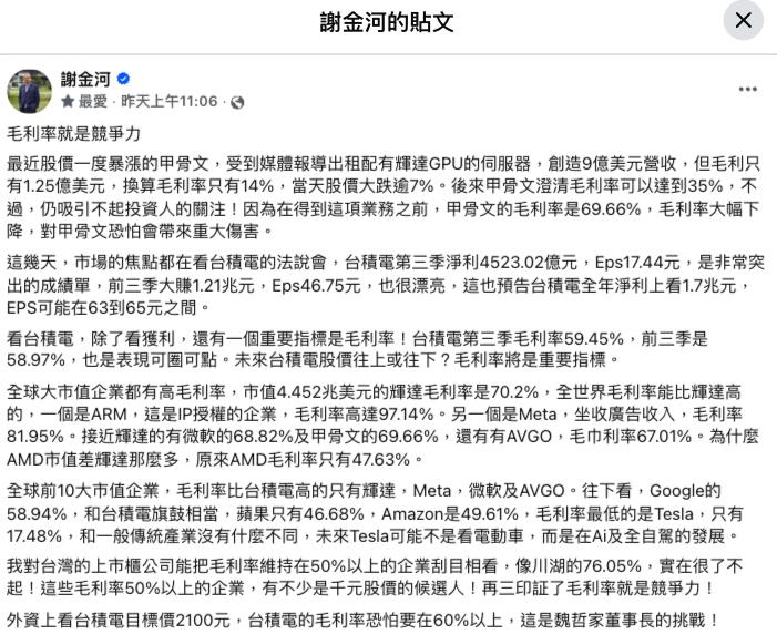 另外,謝金河也在貼文中提及當前全球大市值企業的「高毛利率」情況,全世界最高毛利率的企業是安謀(ARM),其毛利率高達97.14%。坐收廣告收入的Meta,以毛利率81.95%緊隨其後,而接下來則是市值4.45兆美元的輝達(NVIDIA)、毛利率是70.2%。