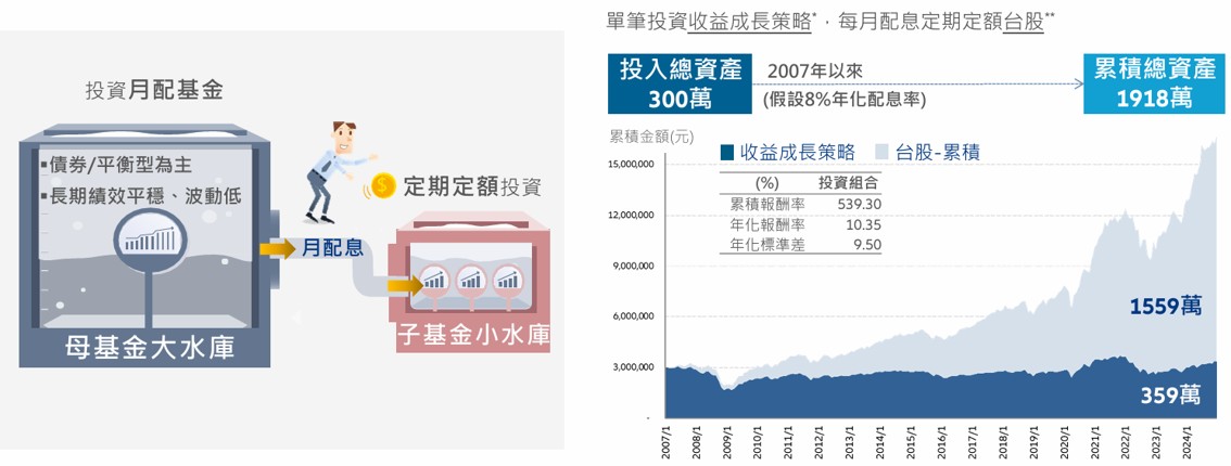 資料來源:Bloomberg、安聯投信整理,回測期間為2007/1/1-2025/9/30。*收益成長策略指數為1/3(羅素1000成長+美銀美國非投資等級債+美銀美國可轉債指數)、**台股為台股加權指數(含息)。期初投入100萬至收益成長策略指數,每月月底將配息金額投資台股指數,假設配 息率8%,月底配息。年化報酬率=(1+累積報酬率)^(1/年數)-1。年化報酬率根據過去累積績效計算,不代表過去及未來每年報酬之保證。標準差被廣泛運用於股票及共同基金投資風險的衡量上,主要是根據股價或基金淨值於一段時間 內波動的情況計算而得來的。一般而言,標準差越大,代表股價或淨值的漲跌越劇烈,風險程度越大。以上指數試算僅供參考,非基金實際績效,亦不保證基金未來之表現。以上僅為歷史資料模擬投資組合之結果,不代表本投資組 合之實際報酬率及未來績效保證,不同時間進行模擬操作,其結果亦可能不同。投資人因不同時間進場,將有不同之投資績效,過去績效亦不代表未來績效之保證。