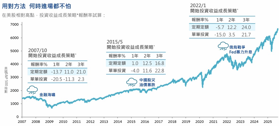資料來源:Bloomberg,安聯投信整理,2025/9/30。假設每次投資3000元、每月月底為扣款日、原幣計算、不計申購手續費用。*收益成長策略指數為1/3(羅素1000成長+美銀美國非投資等級債+美銀美國可轉債指數),月底值、原幣計價。以上指數試算僅供參考,非基金之實際績效,亦不保證基金未來之表現。以上僅為歷史資料模擬投資組合之結果,不代表本投資組合之實際報酬率及未來績效保證,不同時間進行模擬操作,其結果亦可能不同。 投資人因不同時間進場,將有不同之投資績效,過去績效亦不代表未來績效之保證。
