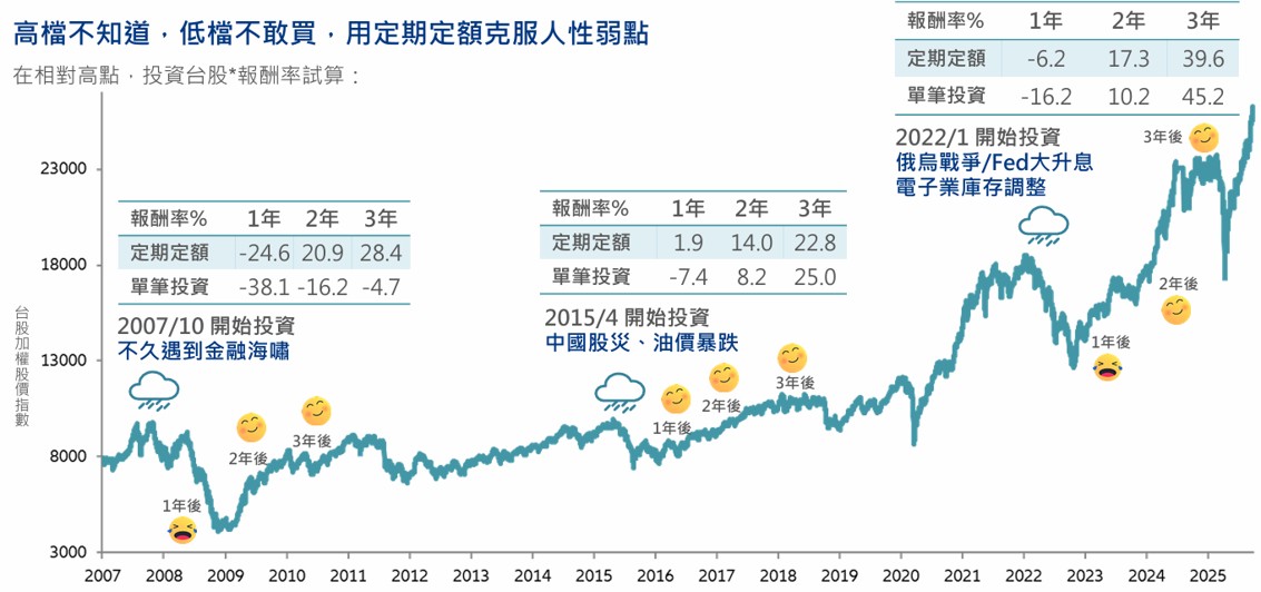 資料來源:Bloomberg,安聯投信整理,資料日期:2025/9/30。假設每次投資3000元、每月月底為扣款日、原幣計算、不計申購手續費用。*台股指數係以台灣加權股價報酬指數試算,月底值、原幣計價。以上指數試算僅供參考,非基金實際績效,亦不保證基金未來之表現。投資人因不同時間進場,將有不同之投資績效,過去績效亦不代表未來績效之保證。