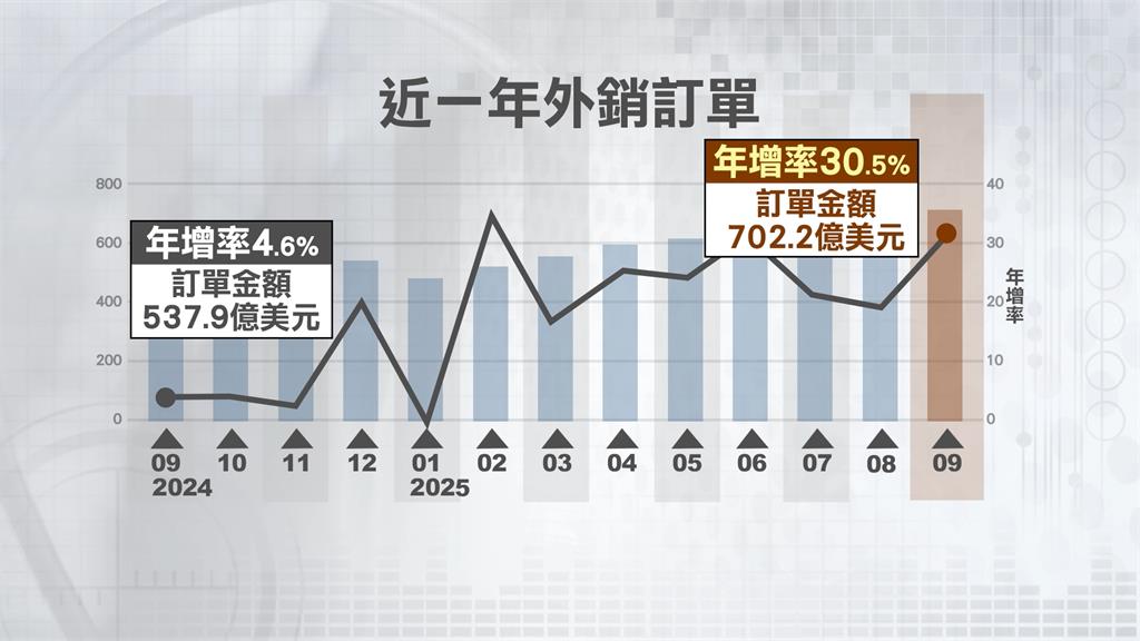 AI熱潮持續延燒!經濟部公布9月外銷訂單702.2億美元,創史上單月新高,年增30.5%,連續八個月正成長。預估第4季AI需求不減,今年外銷接單有望再創紀錄。