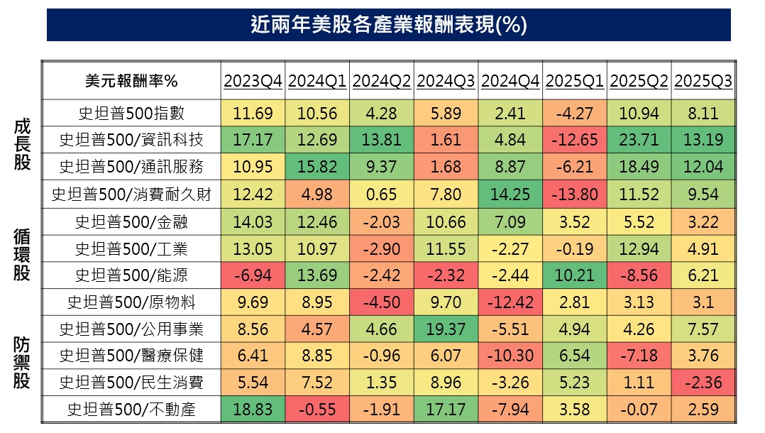 資料來源: 理柏資訊,美元報酬率,2023/Q4~2025/Q3,取季度資料。指數不代表特定基金之投資成果,亦不代表對特定基金之買賣建議,基金不同於指數,基金可能會有中途清算或合併等情形,投資人無法直接投資指數。 <投資人申購本基金係持有基金受益憑證,而非本文提及之投資資產或標的>。
