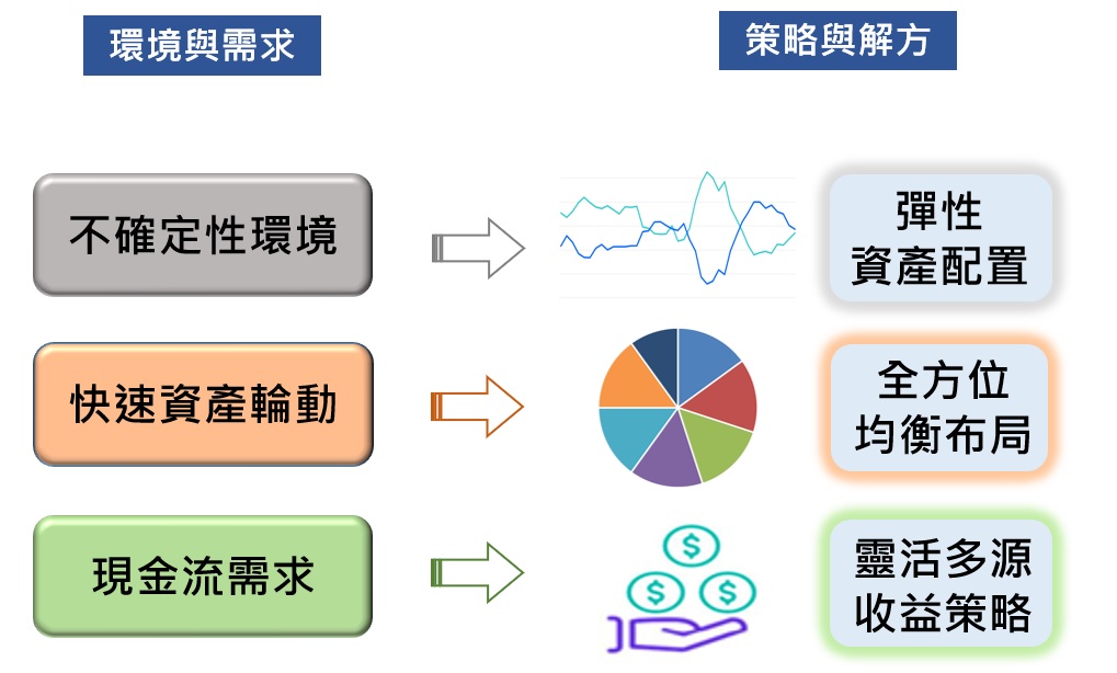 資產全方位配置的同時,輔以收益策略將為投資組合加分。富蘭克林證券投顧盤點收益策略具有三大特色,能因應環境,發揮其效益,(1)不確定性環境中,能於股債資產之間彈性資產配置;(2)當資產快速輪動表現,得以全方位均衡佈局;(3)因應現金流需求,鎖定優質高股息、債息標的,創造靈活多「源」收益機會。