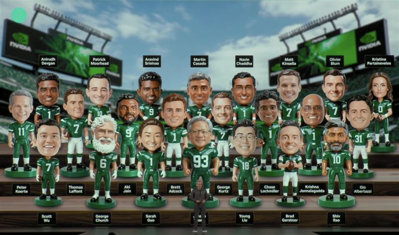 黃仁勳秀出「AI夢幻球隊」公仔牆,象徵AI產業從晶片、醫療到投資全面串聯成一支夢之隊。台廠唯一受邀的鴻海,其董事長劉揚偉也站上C位,在黃仁勳左邊第一位,球衣號碼為18。 (圖/翻攝自YT @Nvidia)