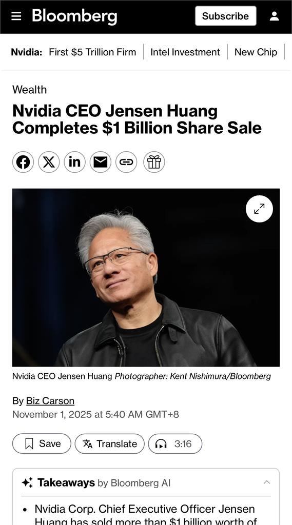 「3個月前,它成為首家市值達4兆美元的公司,如今,它的市值已經達5兆美元,全球唯一一家市值達到5兆美元的公司!」連外媒都大肆報導,因為黃仁勳今年執行賣股計畫,最後一筆交易,在10月29號賣出,共2.5萬股,今年總計10億美元入袋,相當於新台幣近308億,這些股票原本在6月下旬時,價值8.65億美元,短短4個月就大暴漲。