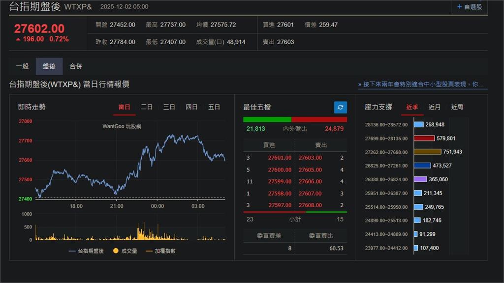 台指期盤後漲196點、漲幅0.72%,收27602點。
