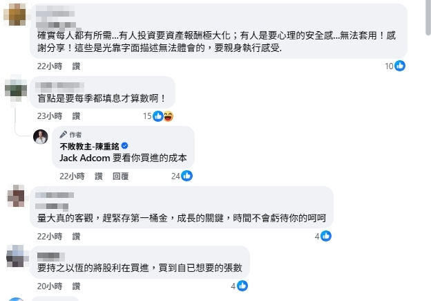 貼文一出後,立刻引發底下網友熱議,有網友對阿伯成果表示佩服:「量大真的客觀,趕緊存第一桶金,成長的關鍵,時間不會虧待你的呵呵」、「要持之以恆的將股利在買進,買到自已想要的張數」、「適合自己的投資就是好投資...」、「財富自由」、「阿伯人生逍遙囉」,不過也有網友認為每個人的需求不同,不一定要盲目跟風,表示:「確實每人都有所需…有人投資要資產報酬極大化;有人是要心理的安全感…無法套用」。
