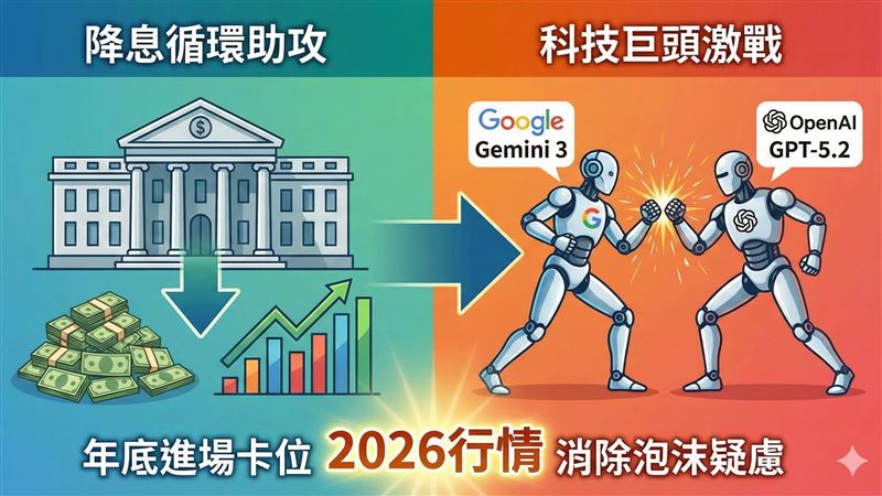 展望2026年,市場法人普遍抱持樂觀態度。隨著美國聯準會(Fed)將於本月10日召開FOMC會議,市場預期降息1碼的機率極高;加上現任主席鮑爾任期倒數,被視為下任熱門人選的哈塞特發言偏鴿,讓明年股市資金面相對寬鬆。在AI發展無虞和降息循環持續的雙重利好因子挹注下,後市可期。